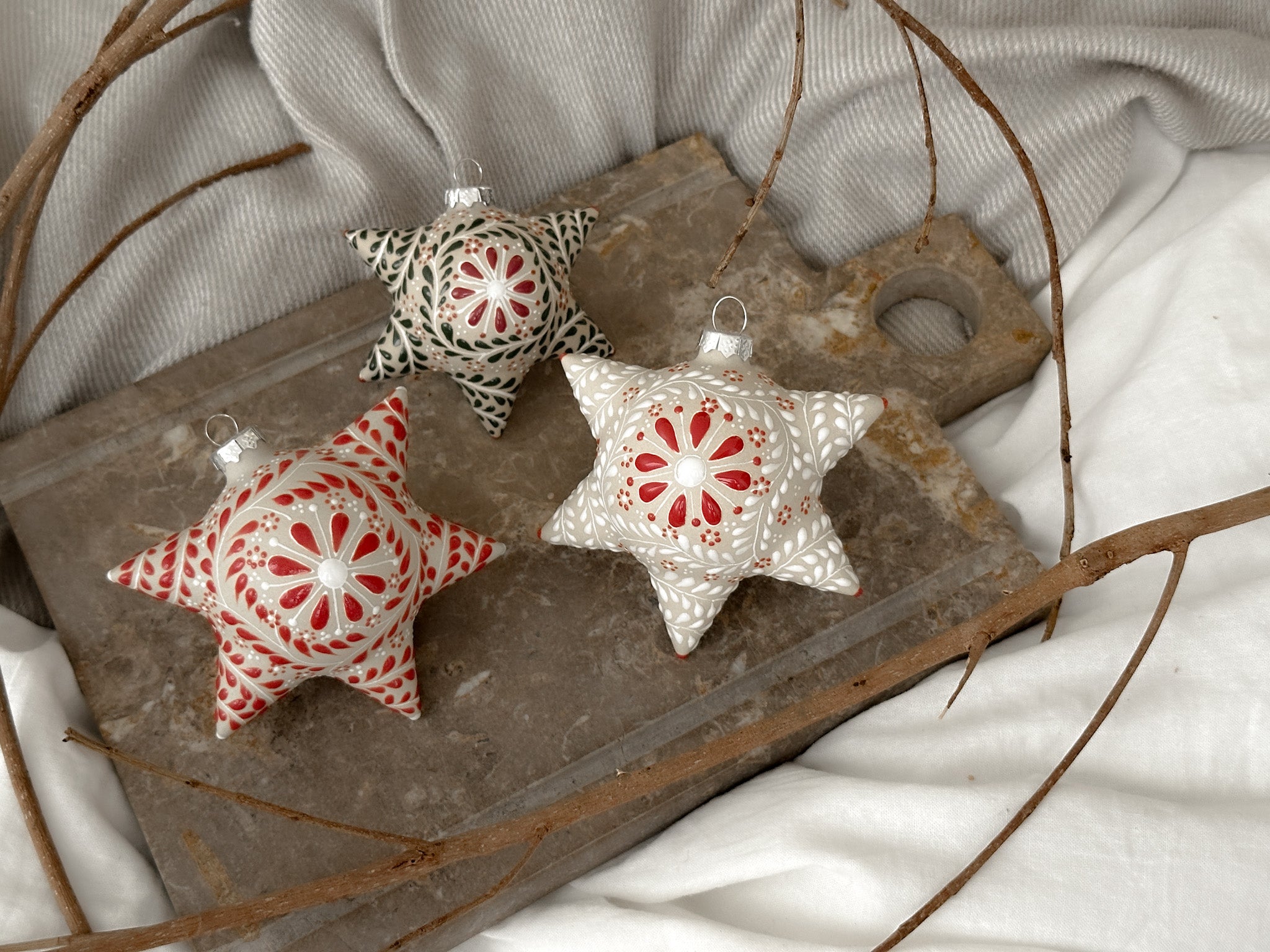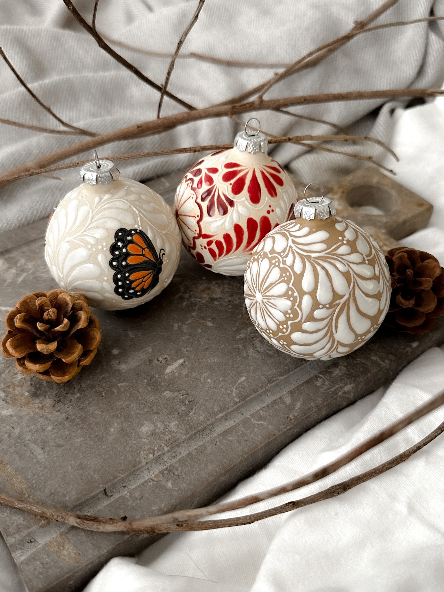 El decorado floral de estas esferas te harán recordar esa cerámica antigua de una casa mexicana. Los colores neutros y clásicos serán perfectos para cualquier decoración en esta temporada.