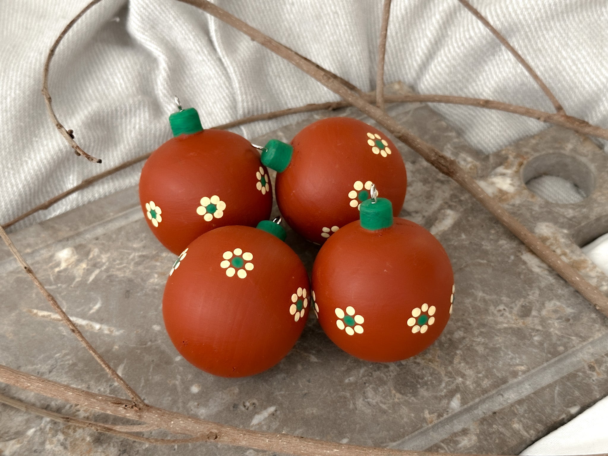 Este año, nuestras esferas oaxaqueñas se inspiraron en el tradicional barro capulineado mexicano. Hechas de madera y pintadas a mano en Tilcajete, Oaxaca.
